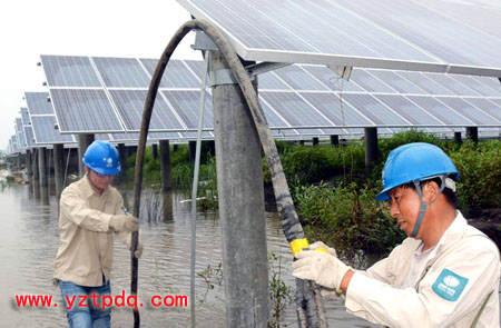 寶應(yīng)漁光互補30兆瓦光伏項目,位于揚州市寶應(yīng)縣射陽湖鎮(zhèn),占地面積930畝,于2013年4月8日開工建設(shè),10月31日并網(wǎng)發(fā)電。經(jīng)寶應(yīng)縣供電公司工程部負(fù)責(zé)人介紹,今年4月初,該供電公司接受該項目工程總承包委托。在項目建設(shè)過程中,公司積極主動工作,從7.5千米長的110千伏線路施工到110千伏變電接入間隔的施工,嚴(yán)格按照施工圖紙進(jìn)行,監(jiān)理全程跟蹤監(jiān)督,對每道工序嚴(yán)格把關(guān),同時,認(rèn)真為客戶做好“漁光互補”光伏項目申報、接入方案制定、基建臨時用電、項目驗收、運行值班人員安全培訓(xùn)等工作。