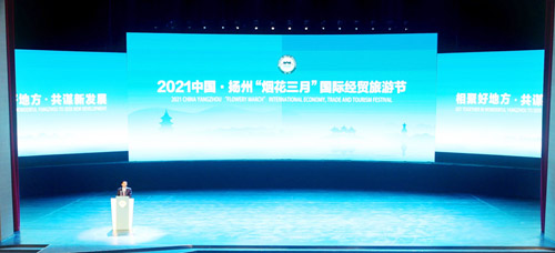 4月18日,2021中國(guó)·揚(yáng)州“煙花三月”國(guó)際經(jīng)貿(mào)旅游節(jié)開幕式暨重大項(xiàng)目簽約儀式在運(yùn)河大劇院舉行。